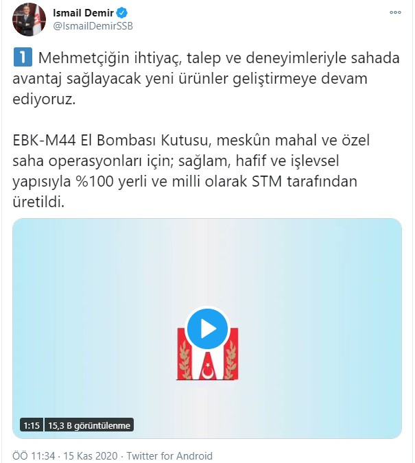 Demir, sosyal medya üzerinden yaptığı açıklamada “Mehmetçiğin ihtiyaç, talep ve deneyimleriyle sahada avantaj sağlayacak yeni ürünler geliştirmeye devam ediyoruz. EBK-M44 El Bombası Kutusu, meskûn mahal ve özel saha operasyonları için; sağlam, hafif ve işlevsel yapısıyla %100 yerli ve milli olarak STM tarafından üretildi. Her türlü çevre koşuluna uygun EBK-M44, 2 saniye içinde, silahı bırakmadan, tek elle el bombasını kullanma imkânı veriyor. Çift emniyet sistemli EBK-M44, pimi çekilmiş olsa bile el bombasını geri koyma ve taşıma imkânıyla operasyonun güvenli şekilde sürmesini sağlıyor. Kendisi küçük, etkisi ve faydası çok büyük olan EBK-M44, girdiği tüm zorlu testleri başarıyla tamamlayarak TSK’nın envanterine girmeye hazır hale geldi.” ifadelerine yer verdi.