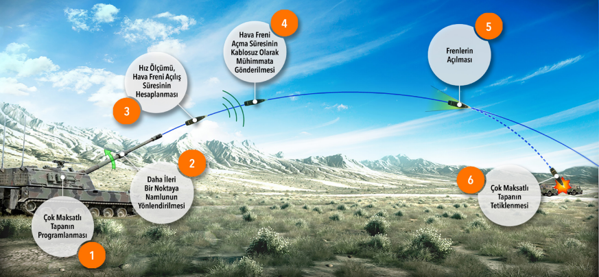 Namlu çıkış hızı, topçu sisteminin ilk hız ölçüm radarıyla tespit edilmektedir. Mühimmatın namlu çıkış hızı dikkate alınarak mühimmat tapası üzerinde bulunan hava frenlerinin açılma zamanı hesaplanmakta ve kablosuz olarak mühimmata iletilmektedir. Son aşamada hava frenlerinin açılmasıyla mesafece dağılım iyileştirilmekte, mühimmatın etkinliği artırılmaktadır.