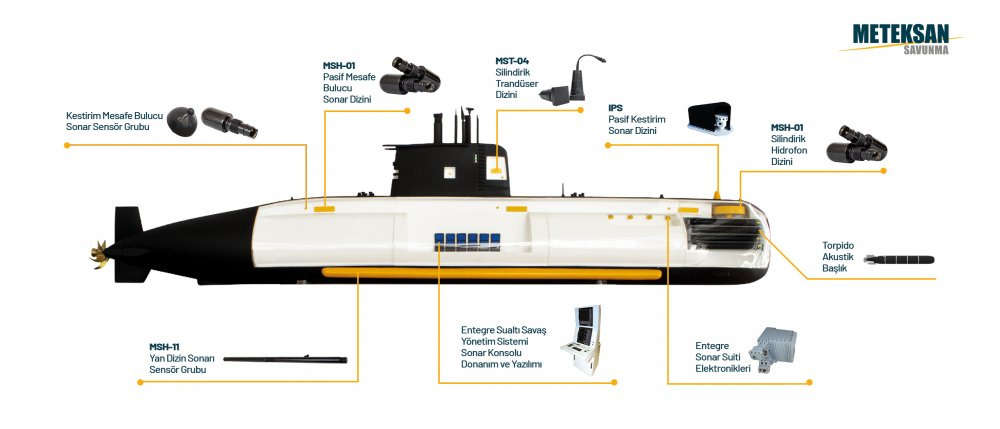 Denizaltıların gövdesi boyunca sancak ve iskele taraflarına monte edilen ve yan dizin sonarı ıslak tarafını oluşturan sensörler ise yine Meteksan Savunma tarafından üretiliyor. MSH-11 sensörünün de hem Türkiye hem de dünya genelinde kullanımda olan Tip 209 Mod 1400 sınıfı denizaltıların yan dizin sonar sistemlerinde kullanılması hedefleniyor.