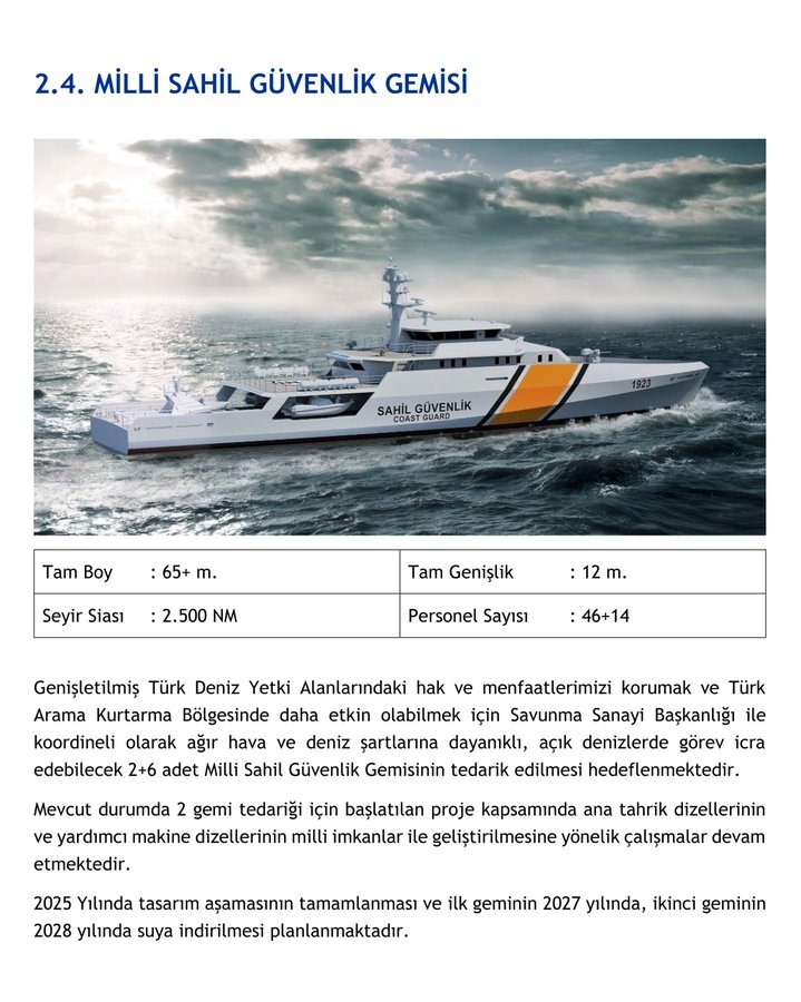 Türkiye, deniz yetki alanlarındaki haklarını korumak ve arama-kurtarma faaliyetlerini daha etkin hale getirmek amacıyla yeni nesil Millî Sahil Güvenlik Gemileri inşa edecek. İlk geminin 2027, ikincisinin ise 2028 yılında suya indirilmesi planlanıyor.
