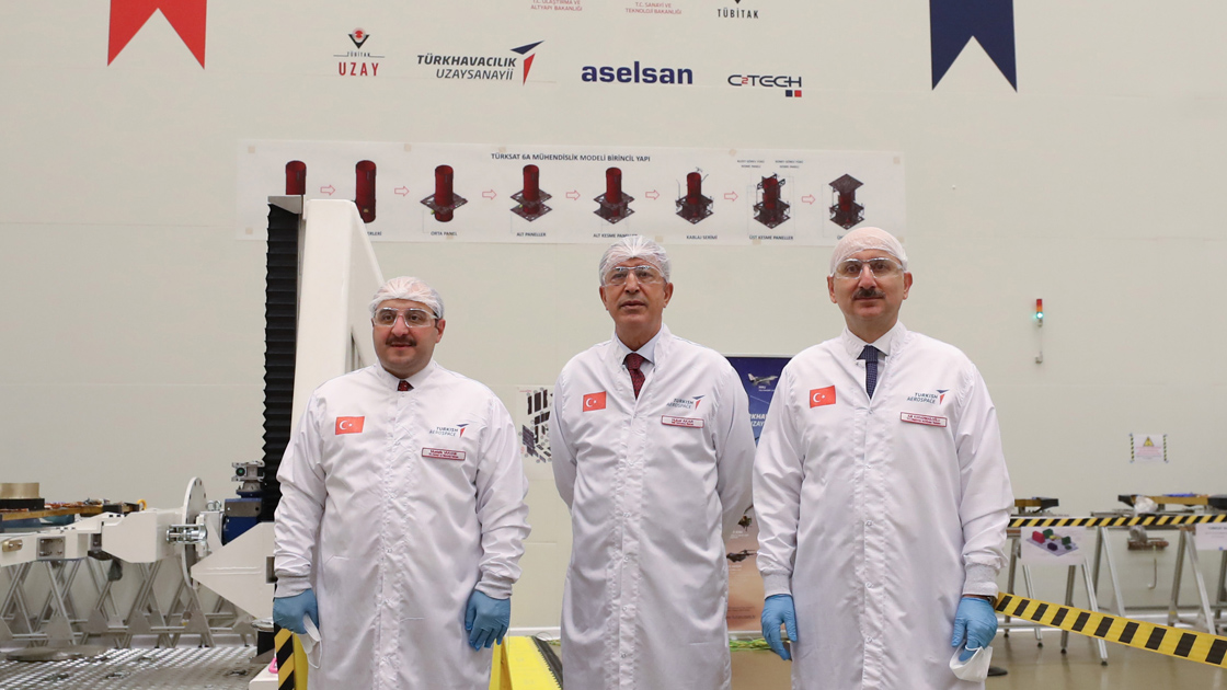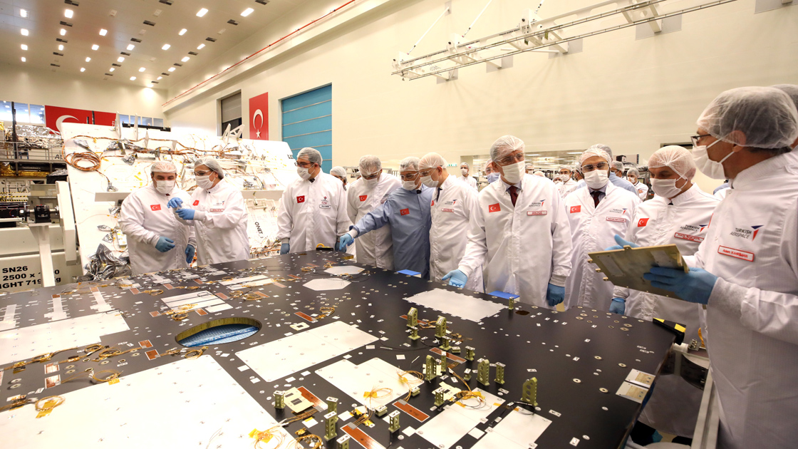 Türkiye’nin ilk yerli ve milli haberleşme uydusu Türksat 6A ile Türkiye’nin ilk yerli ve milli yüksek çözünürlüklü yer gözlem uydusu İmece’nin üretimindeki son durumun değerlendirildiği toplantının ardından TUSAŞ Uzay Sistemleri Entegrasyon ve Test Merkezi’ne geçildi.