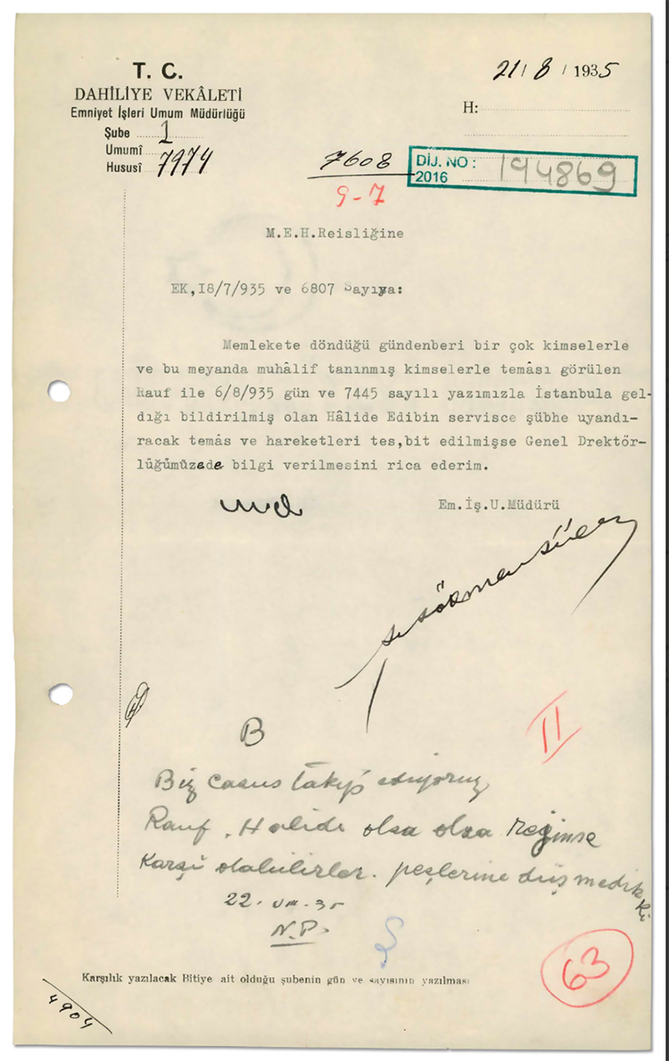 Dahiliye Vekaleti’ne bağlı Emniyet Umum Müdürlüğünün, 1935’te kısa süreliğine Türkiye’ye gelen Halide Edip Adıvar hakkındaki bilgi talebi ve MAH Reis Vekili Naci Perkel’in bu talebe ilişkin, “Biz casus takip ediyoruz. Rauf, Halide olsa olsa rejime karşı olabilirler. Peşlerine düşmedik ki.” sözlerinden oluşan derkenarı da bu belgeler arasında bulunuyor.