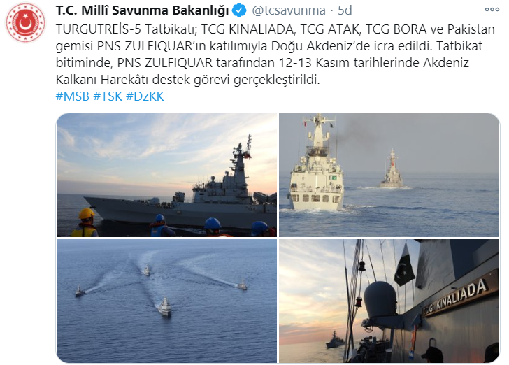 Milli Savunma Bakanlığı resmi twitter hesabından yapılan açıklamada, “TURGUTREİS-5 Tatbikatı; TCG KINALIADA, TCG ATAK, TCG BORA ve Pakistan gemisi PNS ZULFIQUAR’ın katılımıyla Doğu Akdeniz’de icra edildi. Tatbikat bitiminde, PNS ZULFIQUAR tarafından 12-13 Kasım tarihlerinde Akdeniz Kalkanı Harekâtı destek görevi gerçekleştirildi.” ifadeleri kullanıldı.