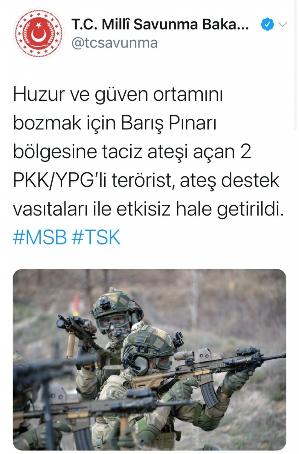 Milli Savunma Bakanlığı (MSB), Barış Pınarı bölgesine taciz ateşi açan 2 PKK/YPG’li teröristin etkisiz hale getirildiğini bildirdi. Bakanlığın Twitter hesabından yapılan açıklamada, “Huzur ve güven ortamını bozmak için Barış Pınarı bölgesine taciz ateşi açan 2 PKK/YPG’li terörist, ateş destek vasıtaları ile etkisiz hale getirildi.” ifadesi kullanıldı.