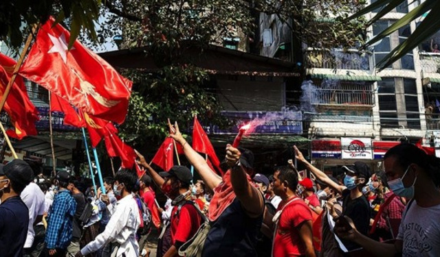 Budist rahipler, işçiler ve öğrencilerin çoğunluğunu oluşturduğu protestocular, gözaltına alınan eski Dışişleri Bakanı ve ülkenin fiili lideri Aung San Suu Çii’nin partisi Ulusal Demokrasi Birliğini (NLD) temsil eden kırmızı bayraklar taşıyarak darbeye tepki gösterdi.
