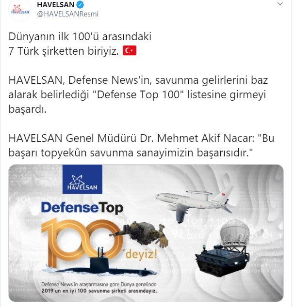 Devler listesine girmeyi başaran 7 şirketten biri olan HAVELSAN’da resmi sosyal medya hesabından HAVELSAN Genel Müdürü Dr. Mehmet Akif Nacar’ın açıklamasını paylaştı. HAVELSAN’ın sosyal medya hesabından yapılan açıklamada,”Dünyanın ilk 100’ü arasındaki 7 Türk şirketten biriyiz. HAVELSAN, Defense News’in, savunma gelirlerini baz alarak belirlediği ‘Defense Top 100’ listesine girmeyi başardı.” ifadeleri yer aldı.