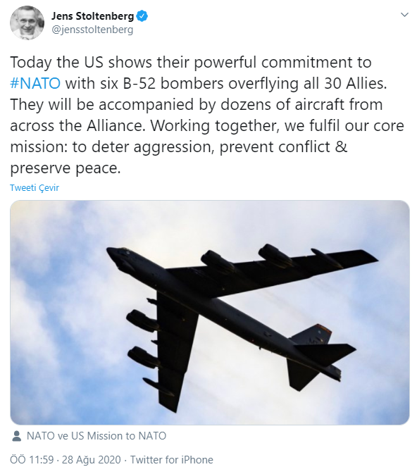 NATO Genel Sekreteri Jens Stoltenberg, tatbikattan önce kendi resmi sosyal medya hesabında paylaşımda bulundu. “Bugün ABD, 30 müttefikin hepsinin üzerinden uçan altı B-52 bombardıman uçağıyla NATO’ya olan güçlü bağlılığını gösteriyor. Birlikte çalışarak temel misyonumuzu yerine getiriyoruz. Saldırganlığı engellemek, çatışmayı önlemek ve barışı korumak.” dedi.
