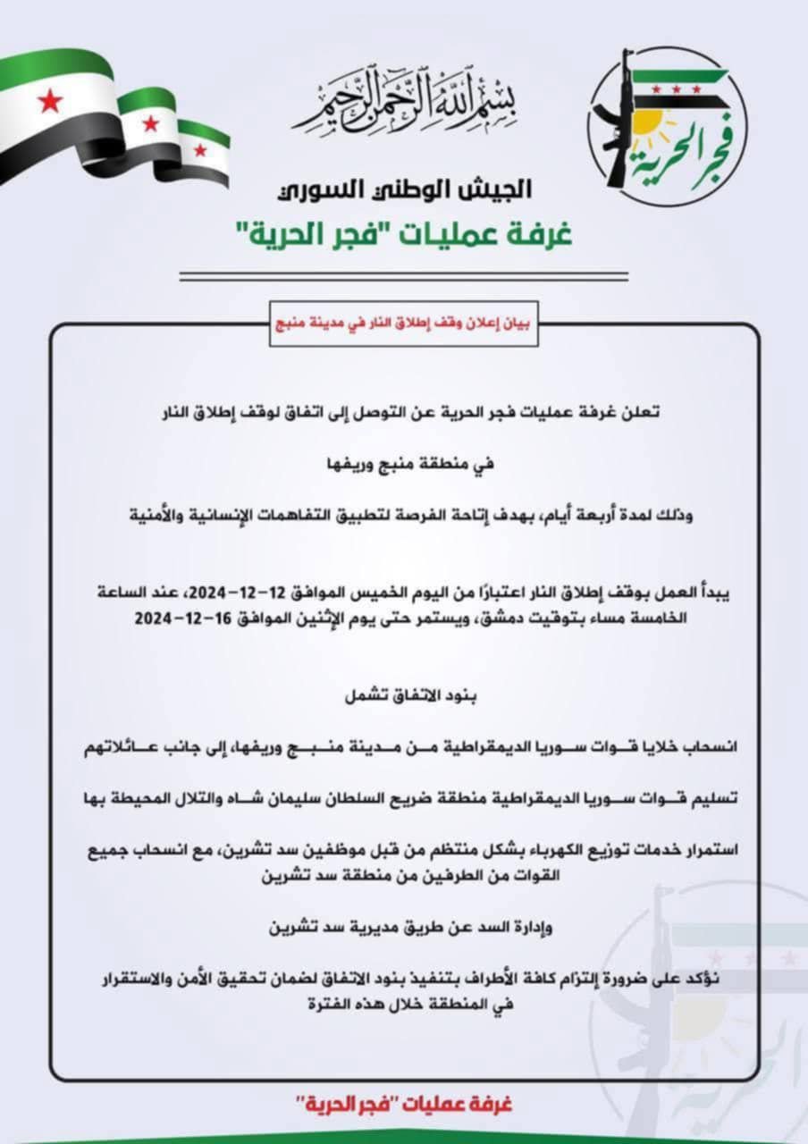 Fecir El-Hurriye Operasyon Odası, Menbiç ve çevresinde ateşkese varıldığını ve ateşkesin ilan edildiğini duyurur.