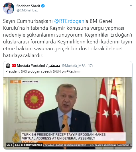 Şerif, resmi Twitter adresinden yaptığı paylaşımda, Cumhurbaşkanı Erdoğan’ın BM hitabında Keşmir’de yaşanan Hint zulmüne karşı yaptığı açıklamalarla alakalı kendisine teşekkürlerini ilettiğini belirtti.
