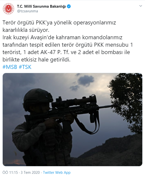 Bakanlıktan yapılan açıklamada, Irak kuzeyi Avaşin’de kahraman komandolarımız tarafından tespit edilen terör örgütü PKK mensubu 1 terörist, 1 adet AK-47 P. Tf. ve 2 adet el bombası ile birlikte etkisiz hale getirildiiği kaydedildi.