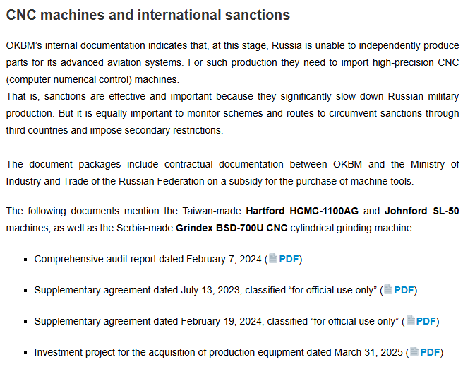 Belgelerde öne çıkan bir diğer önemli başlık ise Rusya’nın ileri üretim teknolojileri konusundaki dışa bağımlılığı. Özellikle, OKBM’nin üretim süreçlerinde ihtiyaç duyduğu CNC (bilgisayarla kontrol edilen) torna ve taşlama makineleri hâlâ büyük ölçüde yurt dışından temin ediliyor. Belgelerde adı geçen bazı ekipmanlar arasında Hartford HCMC-1100AG, Johnford SL-50 ve Grindex BSD-700U gibi Batılı üreticilere ait makineler bulunuyor.