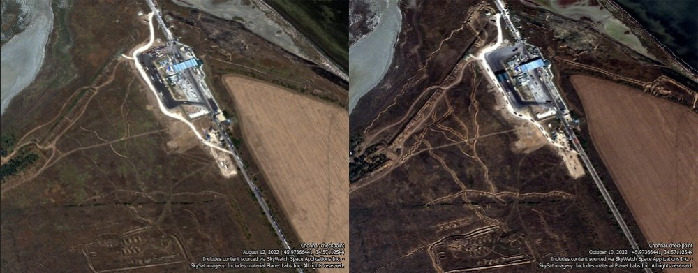 12 Ağustos ve 8 Ekim tarihinde çekilmiş iki farklı uydu görüntüsü yayınlayan Pittet, Herson bölgesi ile Kırım arasında bulunan Çongar kontrol noktasının yakınlarında kurulan yeni koruyucu yapılara dikkat çekti.