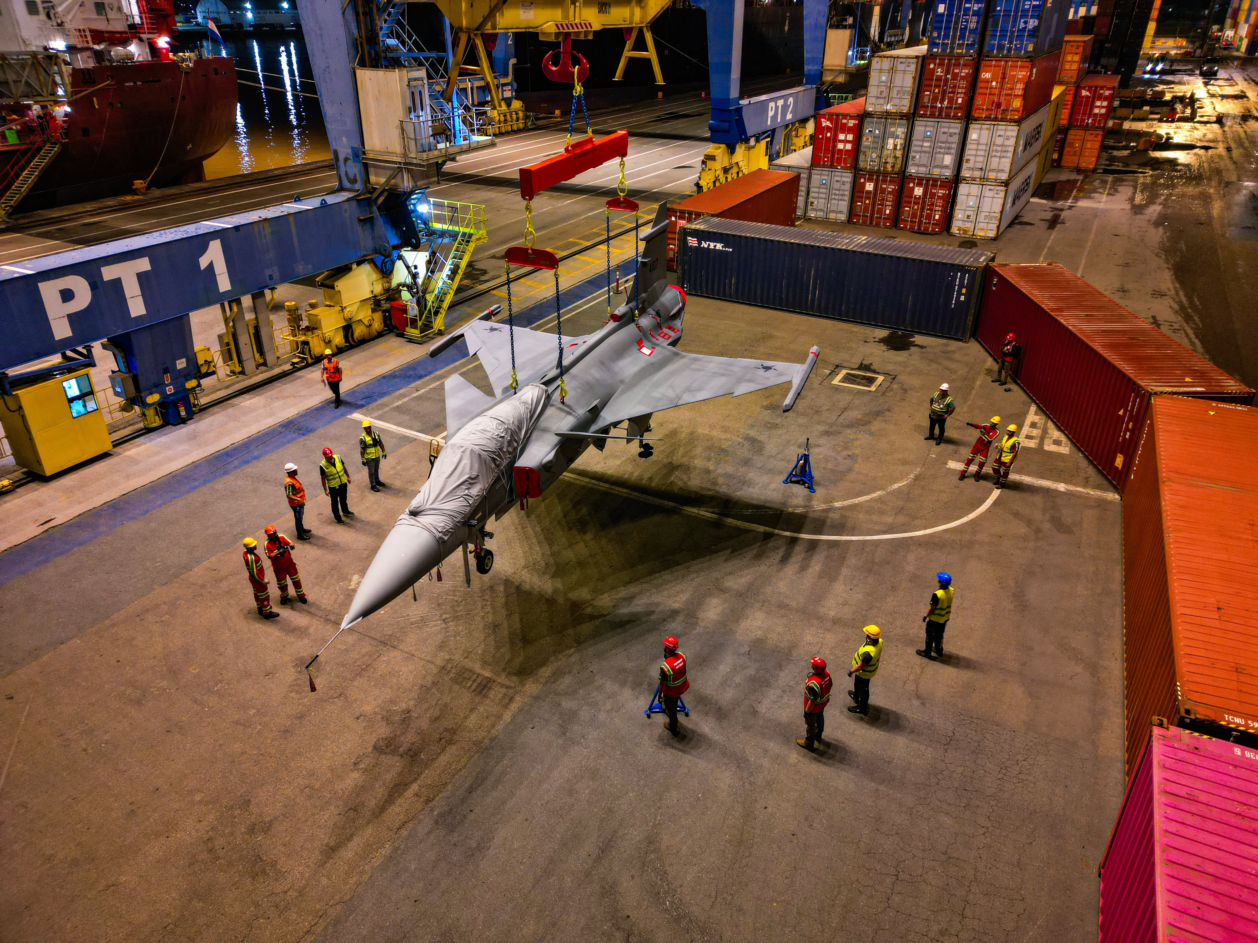 Deniz yoluyla İsveç’ten Brezilya’nın Nevegantes kentine gönderilen uçak, Portonave Limanı’nda gemiden indirilmesinin ardından kara yoluyla yakınlardaki Navegantes Uluslararası Havaalanı’na götürüldü.