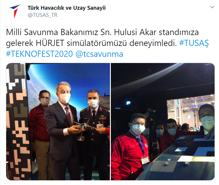 Türk Havacılık ve Uzay Sanayii (TUSAŞ) resmi twitter hesabından yapılan paylaşımda, “Milli Savunma Bakanımız Sn. Hulusi Akar standımıza gelerek HÜRJET simülatörümüzü deneyimledi.” ifadelerine yer verildi.