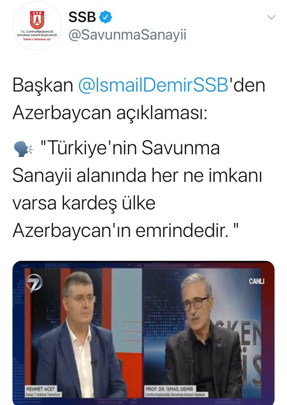 İsmail Demir’in katıldığı televizyon programından ifade ettiği açıklamalar, kısa bir video kesiti şeklinde yayınlandı. Demir yaptığı açıklamalarda, “Türkiye’nin Savunma Sanayii alanında her ne imkânı varsa, kardeş ülke Azerbaycan’ın emrindedir. Bunu her zaman söyledik, bütün kapılarımız açık. Olabilecek her desteği, her ortamda vermeye hazırız. Bunu devletimizin her kademesinde dillendirmiş durumdayız ve dillendirmeye de devam edeceğiz. Bu konudaki kararlılığımız kesin.” ifadelerine yer verdi.