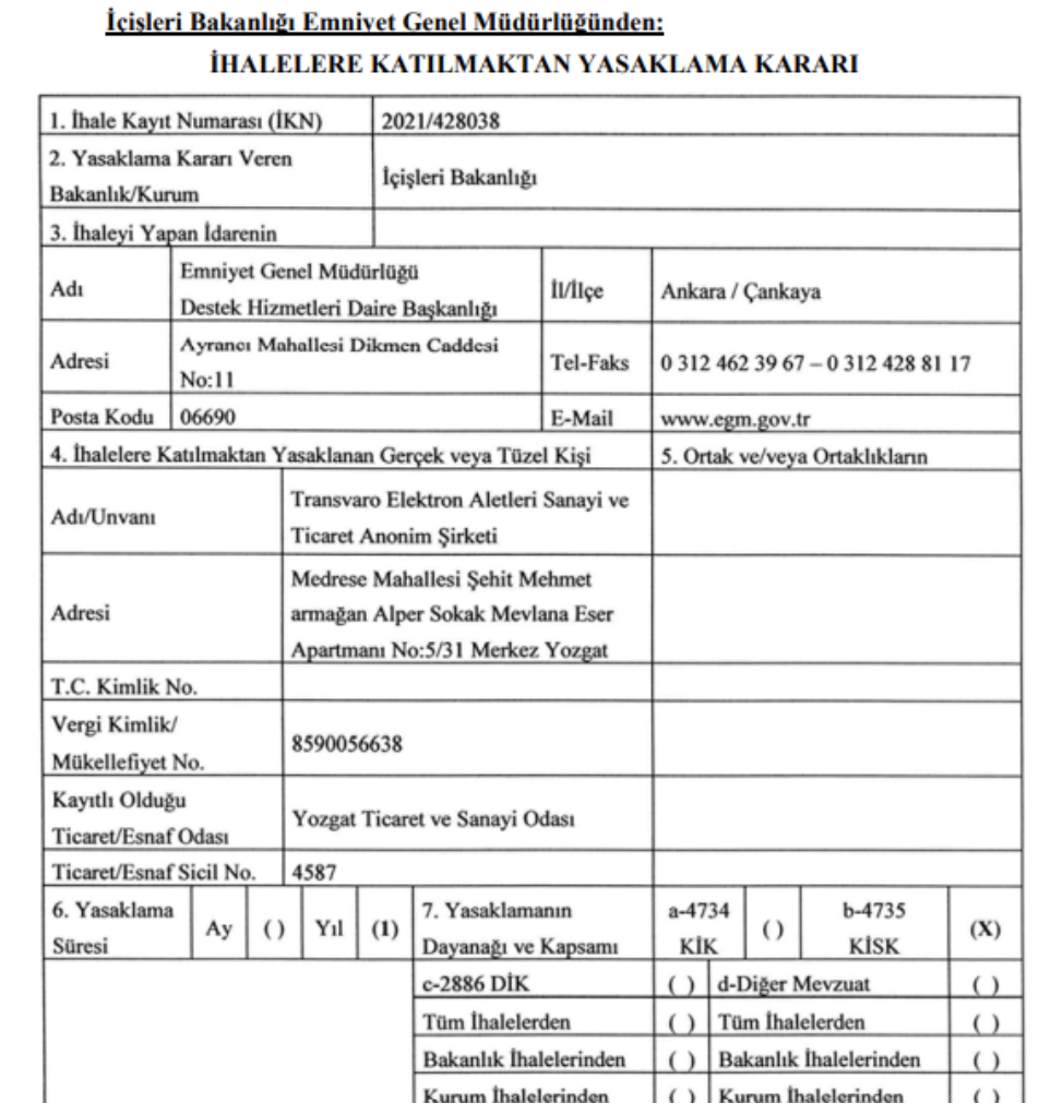 İçişleri Bakanlığı Emniyet Genel Müdürlüğü Destek Hizmetleri Başkanlığı tarafından alınan karar doğrultusunda; Transvaro Elektron Aletleri Sanayi ve Ticaret Anonim Şirketi, 4735 sayılı Kamu İhale Sözleşmeleri Kanunu kapsamında 1 yıl süreyle kamu ihalelerinden yasaklandı.