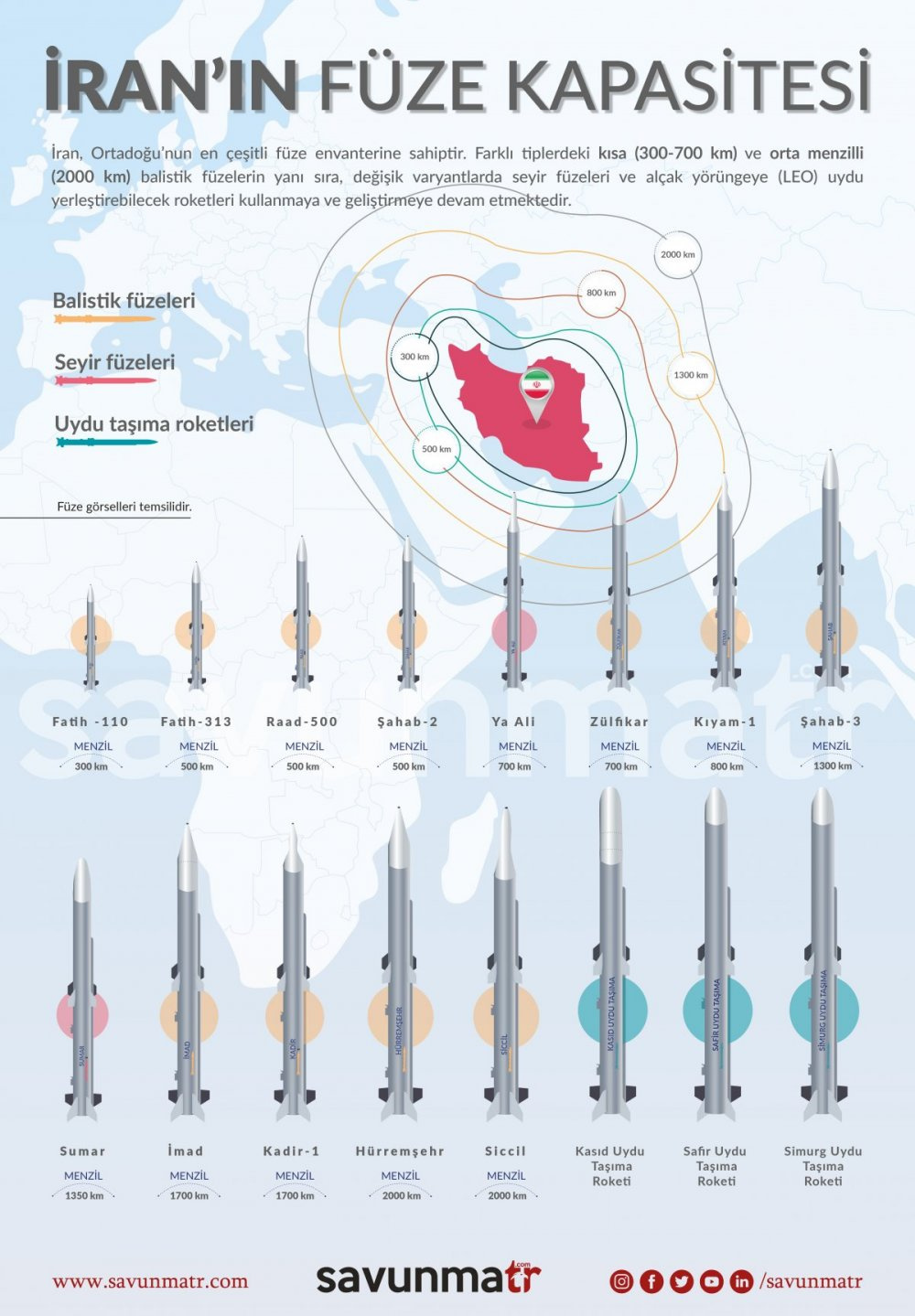 2000 kilometreye ulaşabilen İran’ın orta menzilli balistik füzeleri (MRBM), Ortadoğu’nun tamamını, Doğu Avrupa’nın bazı bölgelerini vurabilecek kapasitededir. Ancak bu füzelerin oldukça büyük bir kısmı yüksek CEP (circular error probable-dairesel sapma oranı) değerine sahiptir. BM raporlarına göre İran’ın orta menzilli balistik füzeleri sadece konvansiyonel değil ‘nükleer’ başlık taşıyabilecek şekilde tasarlanmıştır.