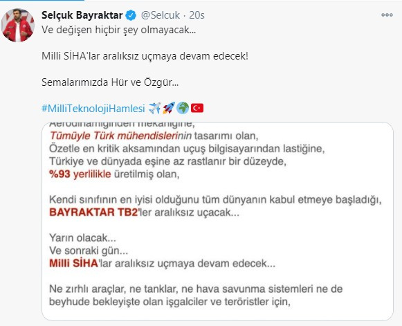 “Yarın olacak… Ve sonraki gün… Milli SİHA’lar aralıksız uçmaya devam edecek… Ne zırhlı araçlar ne tanklar ne hava savunma sistemleri ne de beyhude bekleyişte olan işgalciler ve teröristler için ve hatta şimdi kendi kendini avutmak için uydurduğunuz yalan ve algıyla tepinip sevinen sizler için, değişen hiçbir şey olmayacak… Ve Milli SİHA’lar aralıksız uçmaya devam edecek…”