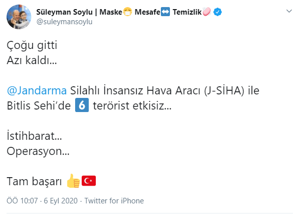Soylu, sosyal medya hesabından yaptığı paylaşımda, “Çoğu gitti, azı kaldı… Jandarma Silahlı İnsansız Hava Aracı (J-SİHA) ile Bitlis Sehi’de 6 terörist etkisiz… İstihbarat… Operasyon… Tam başarı.” ifadelerini kullandı.