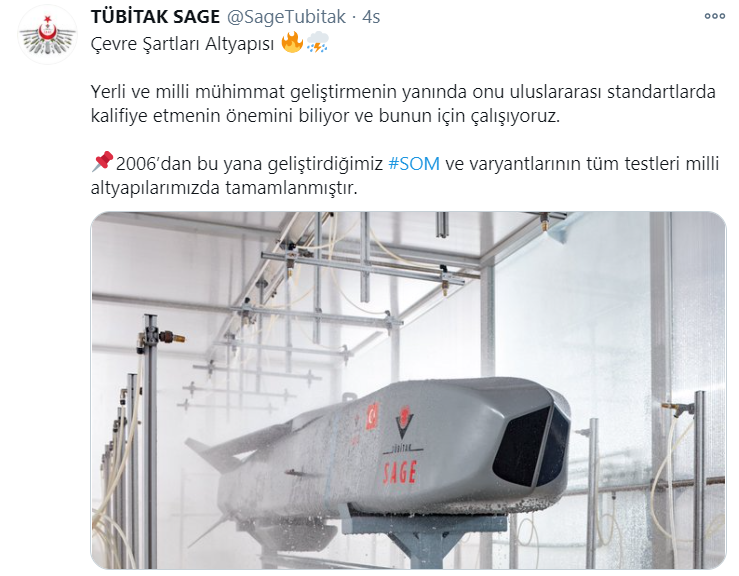 TÜBİTAK SAGE resmi twitter hesabından yapılan açıklamada, “Çevre Şartları Altyapısı. Yerli ve milli mühimmat geliştirmenin yanında onu uluslararası standartlarda kalifiye etmenin önemini biliyor ve bunun için çalışıyoruz. 2006’dan bu yana geliştirdiğimiz SOM ve varyantlarının tüm testleri milli altyapılarımızda tamamlanmıştır.” ifadeleri kullanıldı.