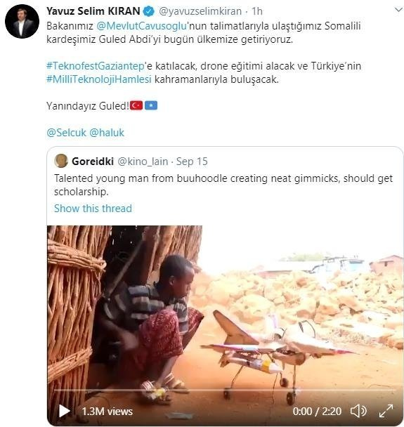 Dışişleri Bakan Yardımcısı Yavuz Selim Kıran, Twitter’daki paylaşımda, “Bakanımız Çavuşoğlu’nun talimatlarıyla ulaştığımız Somalili kardeşimiz Abdi’yi bugün ülkemize getiriyoruz. TEKNOFEST Gaziantep’e katılacak, drone eğitimi alacak ve Türkiye’nin ‘Milli Teknoloji Hamlesi’ kahramanlarıyla buluşacak. Yanındayız Guled!” ifadelerini kullandı.