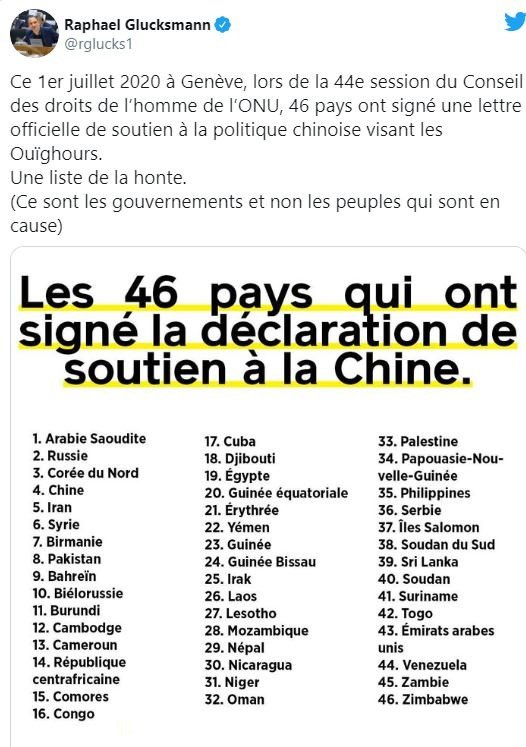 Aralarında halklarının çoğunluğu Müslüman olan, Suudi Arabistan, Mısır, Pakistan, Filistin gibi hükümetlerinde olduğu mektubu imzalayan bu ülkeler, Doğu Türkistan’daki toplama kampları ve kültürel soykırımı görmezden gelerek Çin’e karşı tutumun asılsız suçlamadan ibaret olduğunu iddia etmiş oldu.