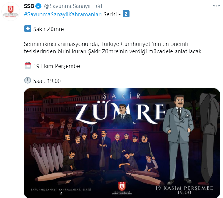 T.C. Cumhurbaşkanlığı Savunma Sanayii Başkanlığı öncülüğünde başlatılan “Savunma Sanayii Kahramanları” animasyon serisinin ikincisi olacak Şakir Zümre animasyonu 19 Kasım Perşembe Günü Saat: 19.00’da SSB sosyal medya hesaplarından yayınlanacak.
