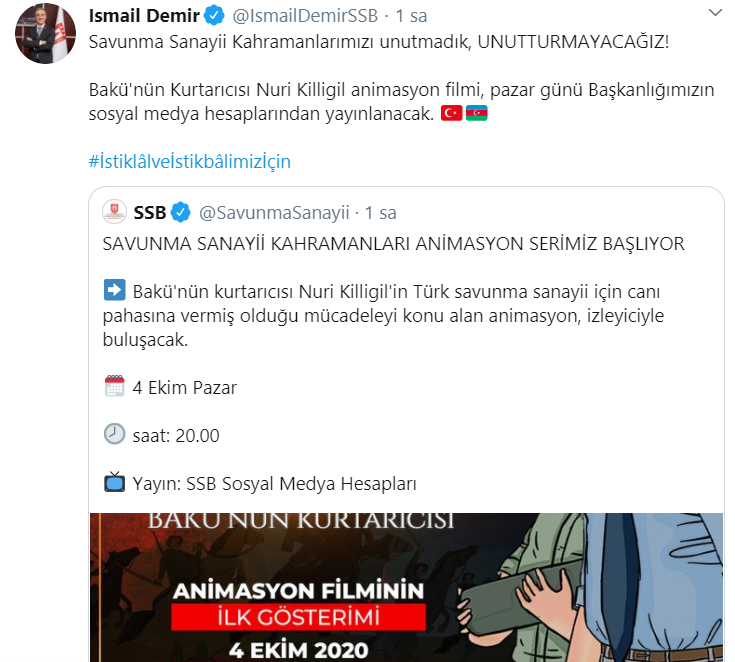 Savunma Sanayii Başkanlığı resmi Twitter hesabından yapılan duyuruda; “SAVUNMA SANAYİİ KAHRAMANLARI ANİMASYON SERİMİZ BAŞLIYOR! Bakü’nün kurtarıcısı Nuri Killigil’in Türk savunma sanayii için canı pahasına vermiş olduğu mücadeleyi konu alan animasyon, izleyiciyle buluşacak. 4 Ekim Pazar, saat: 20.00, Yayın: SSB Sosyal Medya Hesapları” ifadelerine yer verildi.