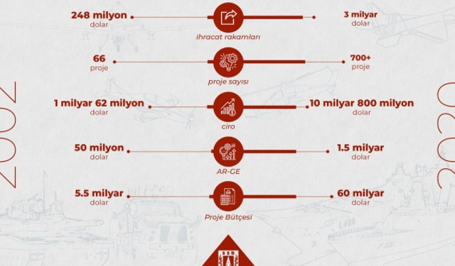 Türk savunma sanayisi'nin 2002-2020 yılları arasındaki gelişimi Savunma Sanayii Başkanlığı tarafından sosyal medyada paylaşıldı.
