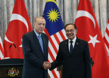 Cumhurbaşkanı Recep Tayyip Erdoğan, Başbakanlık Ofisi'nde, Malezya Başbakanı Enver İbrahim ile düzenlediği ortak basın toplantısında, Türkiye ve Malezya’nın ticaret ve ...