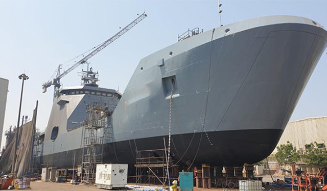 Nijerya Donanması için Hollandalı Damen Tersaneleri tarafından Birleşik Arap Emirlikleri'nin (BAE) Sharjah Limanı'nda inşa edilen çıkarma gemisi LST 100, suya ...
