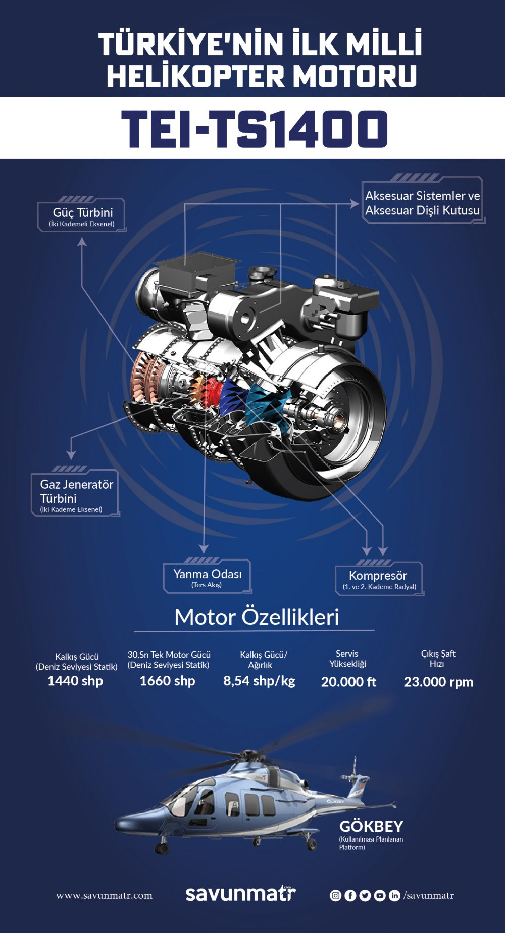 Özgün Helikopter’e entegre edilebilecek, 1400 shp gücünde, tip sertifikası alınmış özgün ve millî motor TEI-TS1400, tamamen yerli imkânlarla geliştirildi.