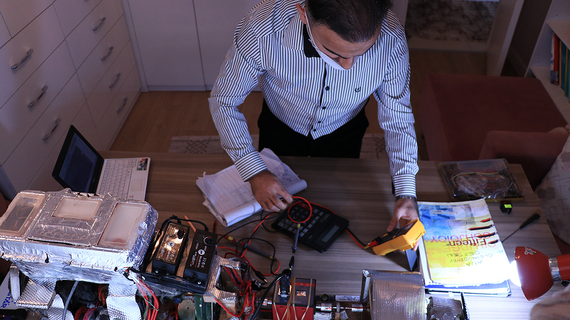 Evinin bir odasını yıllardır laboratuvar ve atölye olarak kullandığını anlatan Abay, her türlü ekipmanı edindiğini, en hassas cihazlardan olan osiloskoptan en kaba tasarıma sahip kaynak makinesine kadar hemen her cihaza sahip olduğunu kaydetti.