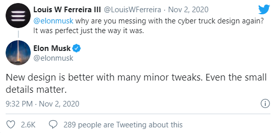 Musk, elektrikli pick-up ile ilgili güncelleme ve değişiklikler hakkında somut bilgi vermezken, Cybertruck’taki iyileştirmelerin üzerinde çalışan tasarım ekibiyle birlikte stüdyoda olduğunu belirtti. Musk, elektrikli pick-up modelinin tasarımıyla ilgili takipçisinin neden bir değişiklik ihtiyacı duyulduğuna yönelik sorusunu yanıtladı. Musk, takipçisine verdiği yanıtta, küçük detayların bir önemli olduğunu söyledi. Cybertruck’ın tasarımında küçük değişiklikler yaptıklarını açıklamalarına ekledi. Aynı zamanda Tesla’nın sahibi, yeniden güncellenen Cybertruck’ın bir ay içerisinde açıklanacağını ifade etti.