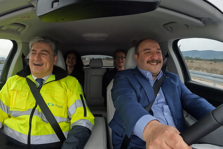 Daha sonra Bakan Varank, Togg CEO’su Karakaş eşliğinde şoför koltuğuna oturdu. Togg’un arka koltuğunda Bakan Varank’ın sosyal medya üzerinden yaptığı çağrı sonucu davet edilen iki öğrenci yer aldı. Uludağ Üniversitesi Bilgisayar Mühendisliği öğrencileri Sena Bahadıroğlu ve Ferit Yiğit Balaban, Varank’ın test sürüşüne eşlik etti.