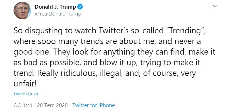 ABD Başkanı Donald Trump, sosyal medya platformu Twitter’ın “gündemdekiler (trending)” listesine ilişkin, “Gerçekten saçma, yasa dışı ve tabii ki adaletsiz.” nitelendirmesinde bulundu.