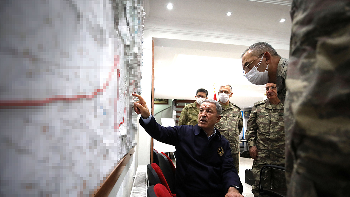 Milli Savunma Bakanı Hulusi Akar ve Türk Silahlı Kuvvetlerinin (TSK) komuta kademesi, Pençe-Kaplan Operasyonu‘nu gece boyunca sınır bölgesindeki harekat merkezinden sevk ve idare ederken dün de operasyonun yapıldığı bölgeye en yakın üs bölgelerinden biri olma özelliğini taşıyan sınırın sıfır noktasındaki Siyah Kaya Üs Bölgesi’ne giderek operasyon bölgesini yerinde inceledi