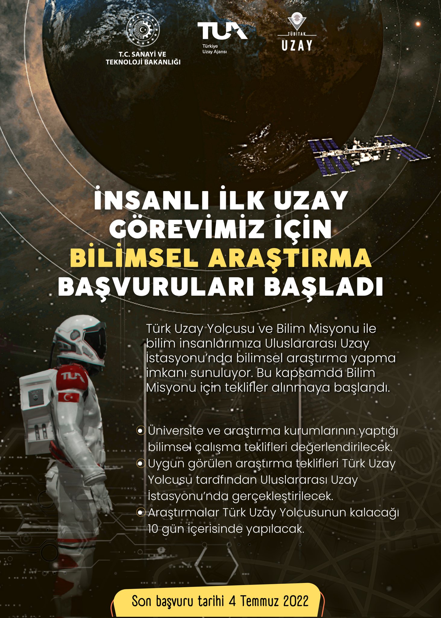 Uluslararası Uzay İstasyonu’nda deney yapmak isteyen bilim insanı veya araştırmacıların başvuruları için son tarih 4 Temmuz 2022 olarak belirlendi. Detaylı bilgiye TÜBİTAK Uzay’dan ulaşılabilir.