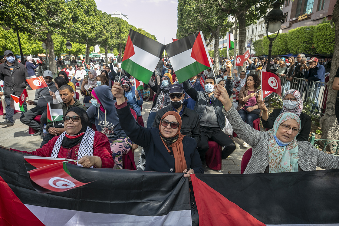 Ellerinde Filistin ve Tunus bayrakları taşıyan eylemciler, Filistin halkına verdikleri desteği ifade etti.