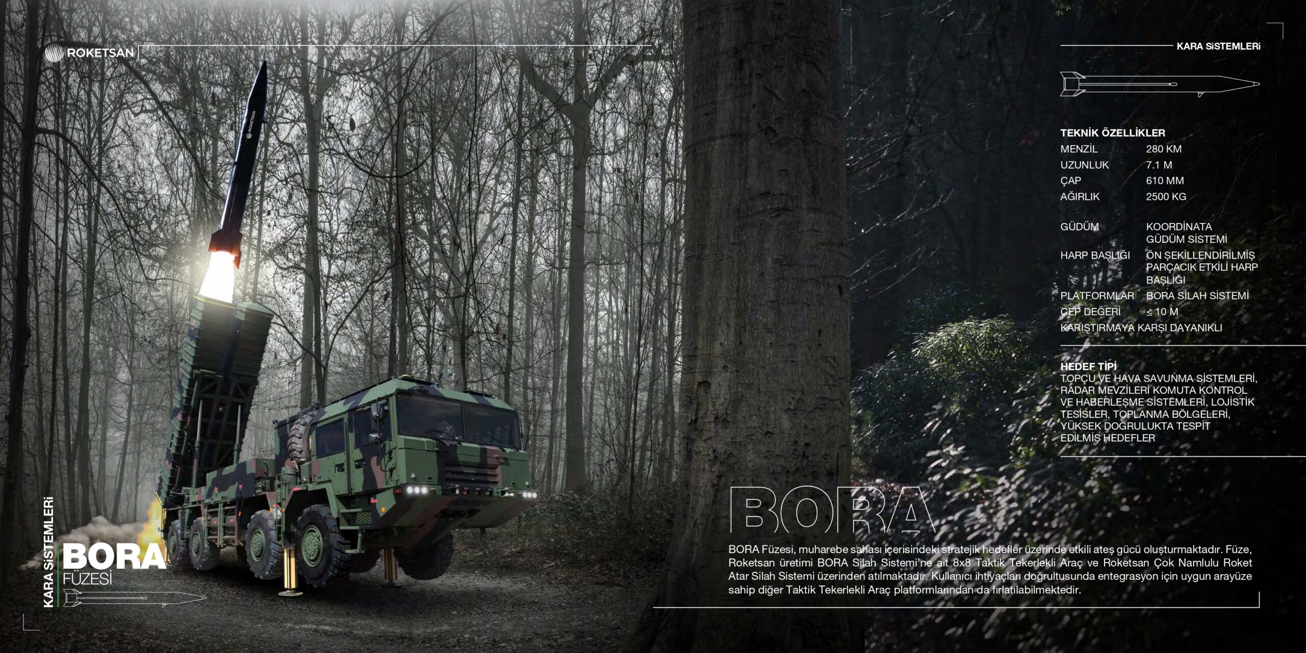 280 kilometreye kadar menzili bulunan Bora füzesi Savunma Sanayii Başkanlığı ile Roketsan arasında 23 Kasım 2009 tarihinde imzalanan “B (BORA) Füzesi ve B (BORA) Silah Sistemi Projesi” adlı sözleşme kapsamında geliştirildi. 2.500 kilogram ağırlığındaki füze 470 kilogramlık parçacık etkili harp başlığı taşıyor ve sahip olduğu KKS destekli ANS güdüm sistemi ile 10 metre hassasiyetle hedefi imha edebiliyor.