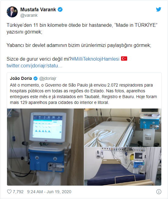 Varank, Twitter hesabından, Sao Paulo Valisi Joao Doria’nın eyaletin kamu hastanelerine dağıtılan Türkiye üretimli solunum cihazlarını içeren görselli mesajını paylaştı.
