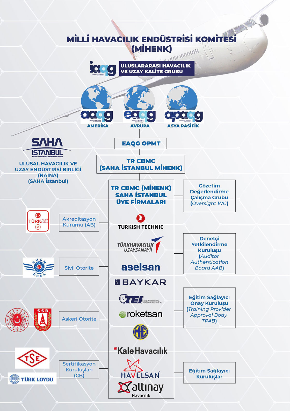 “Uluslararası Havacılık Kalite Grubu (IAQG) ve EAQG, dünya havacılık sektöründe kalite standartlarının belirlenmesinde otorite kurumlar arasında yer alıyor. Bu kurumların altında Sertifikasyon Kuruluşu Yönetim Komiteleri (CBMC) ve Sertifikasyon Grupları (CG) ülkeler nezdinde yerel organları oluşturuyor. Mevcut durumda EAQG bünyesinde sisteme entegre olmuş 12 ülke yer alıyordu. MİHENK, Türkiye’nin de dünya havacılık kalite süreçlerinin bir parçası olabilmesi için SAHA İstanbul tarafından EAQG ile koordineli olarak, ülkenin havacılık endüstrisini oluşturan büyük firmaların temsilcilerinin katılımıyla oluşturuldu. Diğer ülkelerde olduğu gibi CBMC’lerin EAQG yapısal ve elektronik sistemine entegrasyonu tamamlandı. Böylece Türkiye, EAQG entegrasyonunu tamamlayan 13’üncü ülke oldu.”