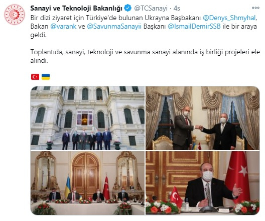Savunma Sanayii Başkanlığı resmi Twitter hesabından yapılan açıklamada, ”Türkiye’de bulunan Ukrayna Başbakanı Denis Şmıgal, Sanayi ve Teknoloji Bakanı Mustafa Varank ve Savunma Sanayii Başkanı İsmail Demir ile bir araya geldi. Toplantıda, sanayi, teknoloji ve savunma sanayii alanında iş birliği konuları görüşüldü.” ifadelerine yer verildi.