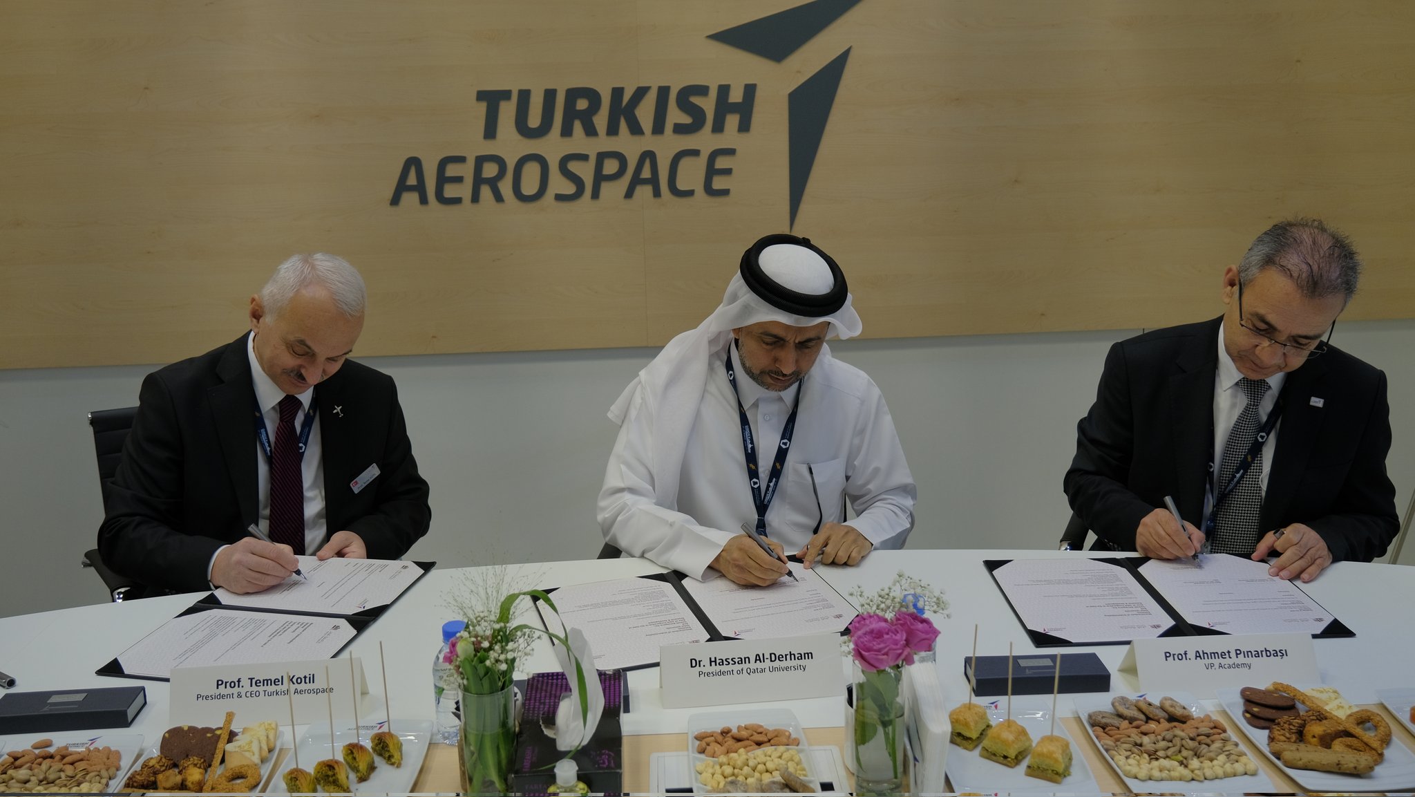 Anlaşma TUSAŞ Genel Müdürü Temel Kotil, Prof. Dr. Ahmet Pınarbaşı ve Katar Üniversitesi Rektörü Hassan Rashid Al-Derham arasında imzalandı.