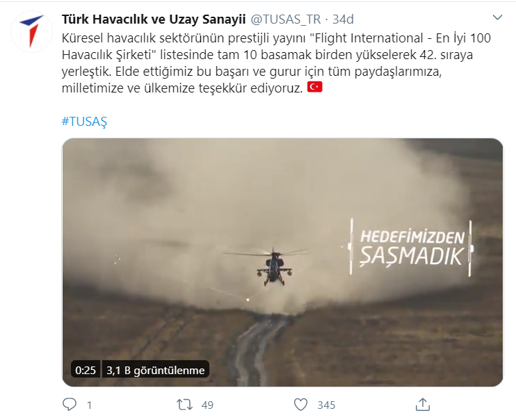 Türk Havacılık ve Uzay Sanayii (TUSAŞ) resmi twitter hesabından yaptığı paylaşımda, “Küresel havacılık sektörünün prestijli yayını “Flight International – En İyi 100 Havacılık Şirketi” listesinde tam 10 basamak birden yükselerek 42. sıraya yerleştik. Elde ettiğimiz bu başarı ve gurur için tüm paydaşlarımıza, milletimize ve ülkemize teşekkür ediyoruz.” ifadelerini kullandı.