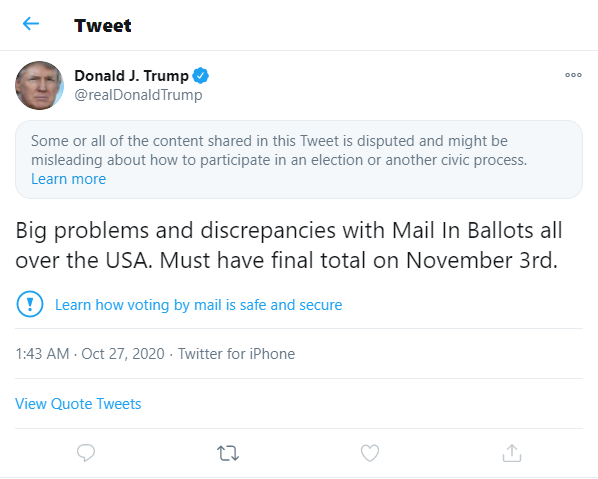 USA Today tarafından yapılan habere göre, Twitter, “mail ile oy verme” ve “seçim sonuçları” hakkında yanlış bilgilerin peşine düşüleceğini duyurmuştu. Twitter, yaptığı uyarıdan kısa süre sonra Trump’ın attığı bir tweet’i etiketledi.
