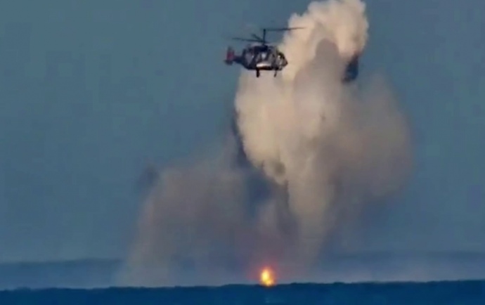 Videoda, USV’nin helikopterden kaçmak için yaptığı sert manevralara rağmen helikopterin ateşli silahları tarafından sonunda vurularak imha edildiği görülüyor.