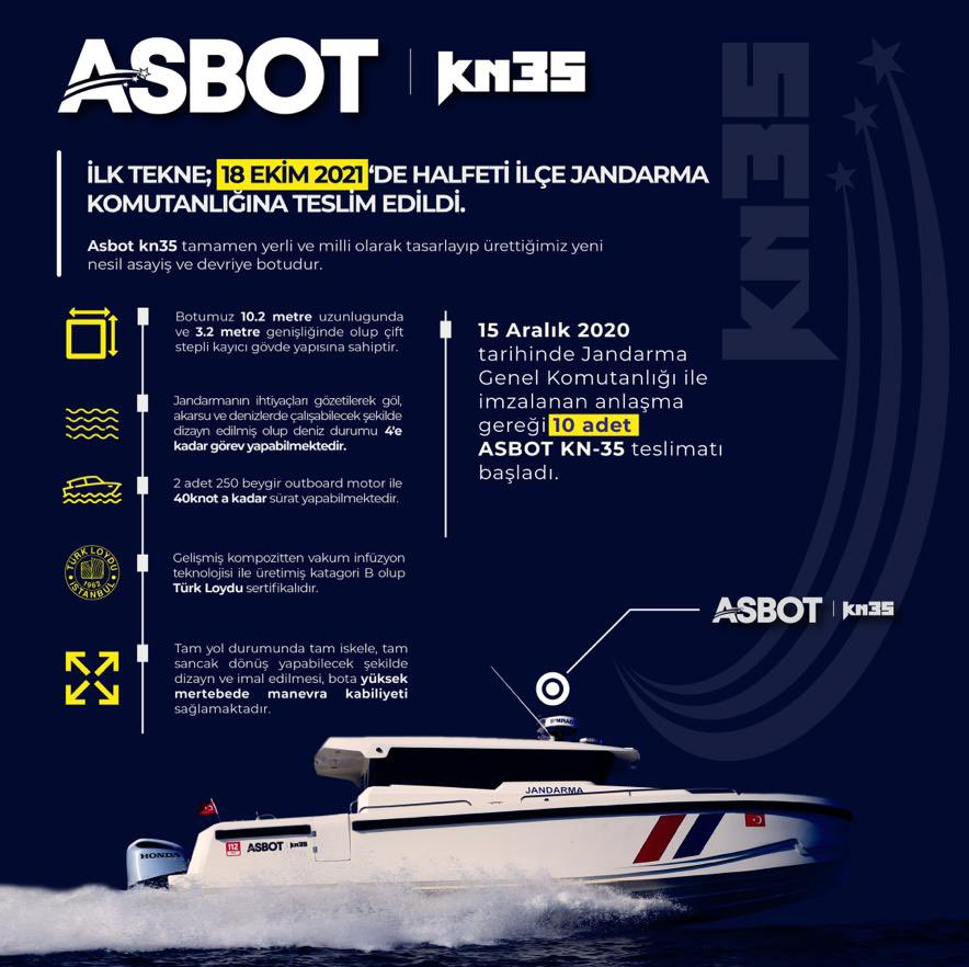 “Jandarma Genel Komutanlığı ile imzalanan anlaşma çerçevesinde sadece 10 ayda yerli ve milli olarak tasarımı, prototip üretimi ve testleri tamamlanıp seri üretime alınan yeni nesil asayiş ve devriye botumuz ASBOT KN-35” ifadelerini kullandı.