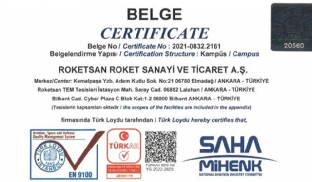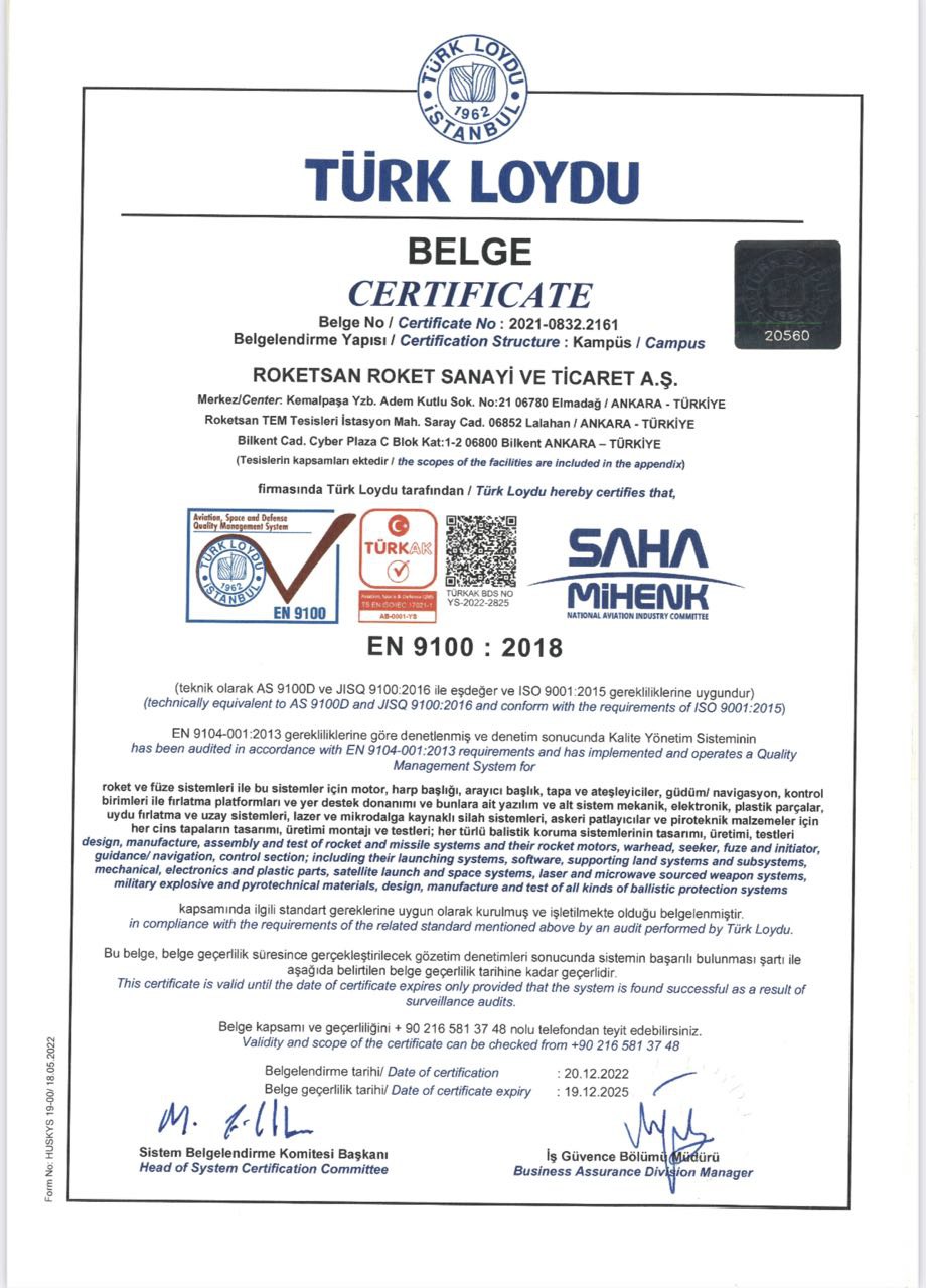 ROKETSAN’ın AS9100 kurulumunu SAHA MİHENK üzerinden EAQG gözetiminde denetleyen Türk Loydu’nun AS9100 belgesi verebilme (Sertification Body) yetkisi TÜRKAK tarafından akredite edilmiş oldu. Böylece TÜRKAK tarafından akredite edilen TÜRK LOYDU, AS9100 belgesi vermeye yetkili ilk Türk firması oldu.