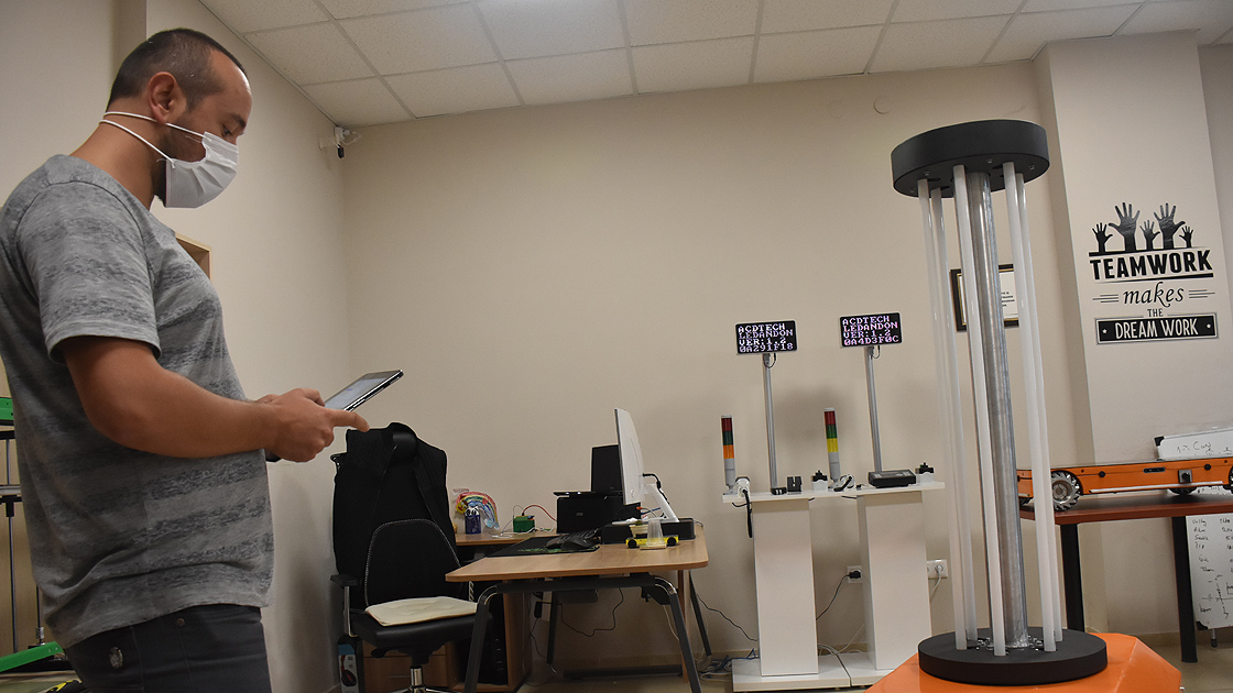 “Robot öncelikle görev yapacağı ortamın haritasını çıkarıyor. Dezenfeksiyon alanının konumu, dezenfeksiyonda görevli kişinin yetkisi, ortamda canlı olmaması gibi durumlar kontrol ediliyor. Tüm şartlar dezenfeksiyon için sağlanıyorsa robot ilgili alana girer, daha önceden haritasını çıkardığı ortamda belirli noktalarda, belirli süre durarak görevini tamamlar. Dezenfeksiyon esnasında odaya bir canlının girmesi durumunda, bunu algılayarak kendisini pasife alır. Çünkü UV-C ışığı canlılar için çok tehlikeli.”